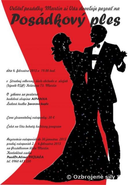 dovoľte, aby som sa Vás v mojom mene a v mene veliteľov útvarov posádky Martin, čo najsrdečnejšie pozval na posádkový ples, ktorý sa uskutoční 6. februára 2015 o 19,00 hod. v Strednej odbornej škole obchodu a služieb Martin.