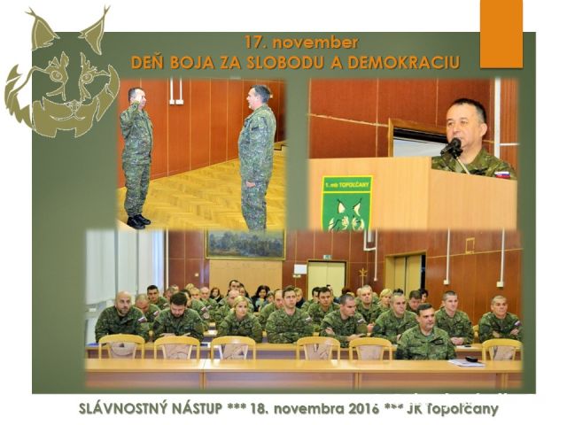 Príslušníci a zamestnanci veliteľstva 1. mechanizovanej brigády (1.mb) a roty podpory velenia si v posádke Topoľčany slávnostným nástupom dňa 18. novembra 2016 pripomenuli dvadsiate siedme výročie Dňa boja za slobodu a demokraciu, všeobecného nenásilného odporu občanov proti totalitnému režimu, pod ktorým tento padol a uvoľnil cestu k demokracii.