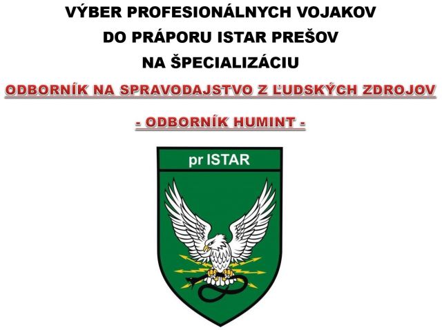 Veliteľ pozemných síl OS SR vyhlasuje výber profesionálnych vojakov na obsadenie funkcií - odborník na spravodajstvo z ľudských zdrojov (ďalej len odborník HUMINT)  - na rote spravodajskej podpory práporu ISTAR Prešov. Informácie o výbere sú uvedené v propozíciách.
