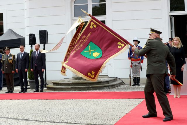 Zapožičanie bojovej zástavy Základni výcviku a mobilizačného doplňovania Martin Príslušníci Základne výcviku a mobilizačného doplňovania Martin si 24. mája 2022 slávnostne prevzali zapožičanú bojovú zástavu, ako znak cti a uznania práce a dosiahnutých výsledkov základne. V priestoroch Grasalkovičovho paláca ju z rúk prezidentky a zároveň hlavnej veliteľky OS SR Zuzany Čaputovej prevzal veliteľ základne plukovník Pavol Barančík. „Profesionáli zo Základne výcviku a mobilizačného doplňovania v Martine plnia nesmierne dôležité úlohy výcviku príslušníkov OS SR. Sú to oni, ktorých výcvikom prechádzajú noví profesionálni vojaci v radoch Ozbrojených síl SR, pričom len tento rok pripravili na službu vlasti 657 čakateľov. Samozrejme, veľmi dôležitá je aj ďalšia odborná príprava a špecializovaný výcvik. Na svoju prácu môžu byť právom hrdí,“ povedal s ocenením minister obrany SR Jaroslav Naď, ktorý sa na slávnostnom ceremoniáli zúčastnil spolu so štátnym tajomníkom rezortu Marianom Majerom a náčelníkom Generálneho štábu OS SR generálom Danielom Zmekom.